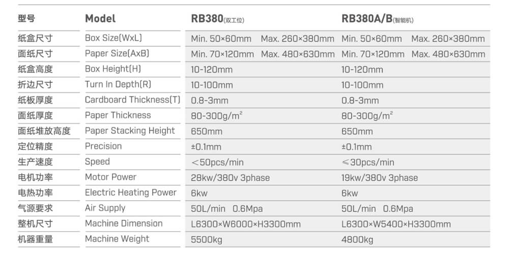 應用範圍廣: RB380可以生產各種類型(xíng)的盒子,包括禮品盒、鞋(xié)盒、化(huà)妝品盒等,因此(cǐ)適合(hé)在許多不同行業使用。